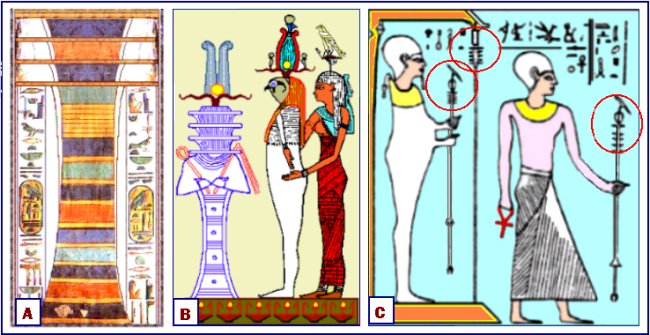 Image A - Malgré que la forme architecturale de ces colonnes peinte aux couleurs vives nous rappellent d'abord les colonnes des temples antiques, mais dans ce cas ils deviennent des piliers DJED et ils symbolisent la colonne vertébrale d'Osiris avec la moelle de la résurrectionImage B - On retrouve la partie basse de la colonne vertébrale d'Osiris, mais ce qui nous intéresse particulièrement est la partie à forme dynamique étrange qui stylise la partie réservée au visage qui ressemble fortement aux trois éléments dessinés sur l'image C.