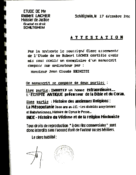 Une copie de ce manuscrit a été scellée par Maître Lacher Huissier de Justice à Schiltigheim pour servir en cas de recours légal. Même sur Internet ces textes restent la propriété exclusive de l'auteur Jean Claude Brinette et de ses descendants.L'utilisation en totalité ou en partie des textes (chapitres ou citations partielles) sont autorisées à titre privé et non lucratif à condition de mentionner dans les citations le nom de l'auteur. En matière de reproduction commerciale ils restent la propriété de l'auteur, et ne peuvent être vendus sans son autorisation écrite ou d'un éditeur dûment mandaté par lui..